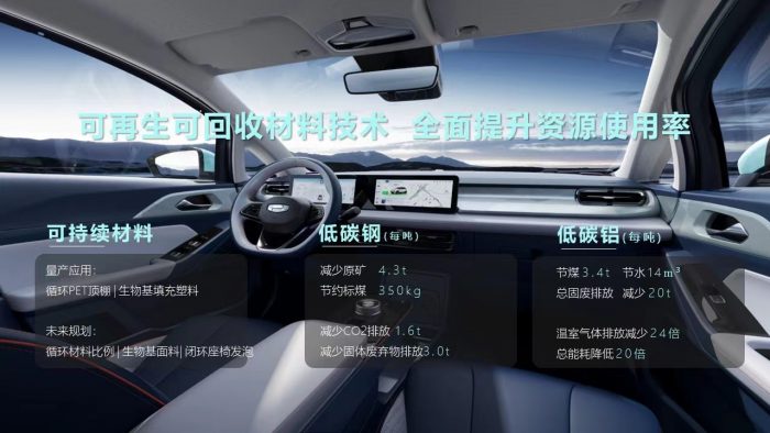 极氪009全车采用环境友好型材料,应用可持续、生物基材料,从价值链源头发力,减少资源使用和环保过程无污染。如座舱表面采用的原生态环保真皮材料,牛皮回收后可被自然降解;顶棚、立柱、遮阳板应用的生物基麂皮绒,实现了植物性原料占比30%,达世界最高比例。